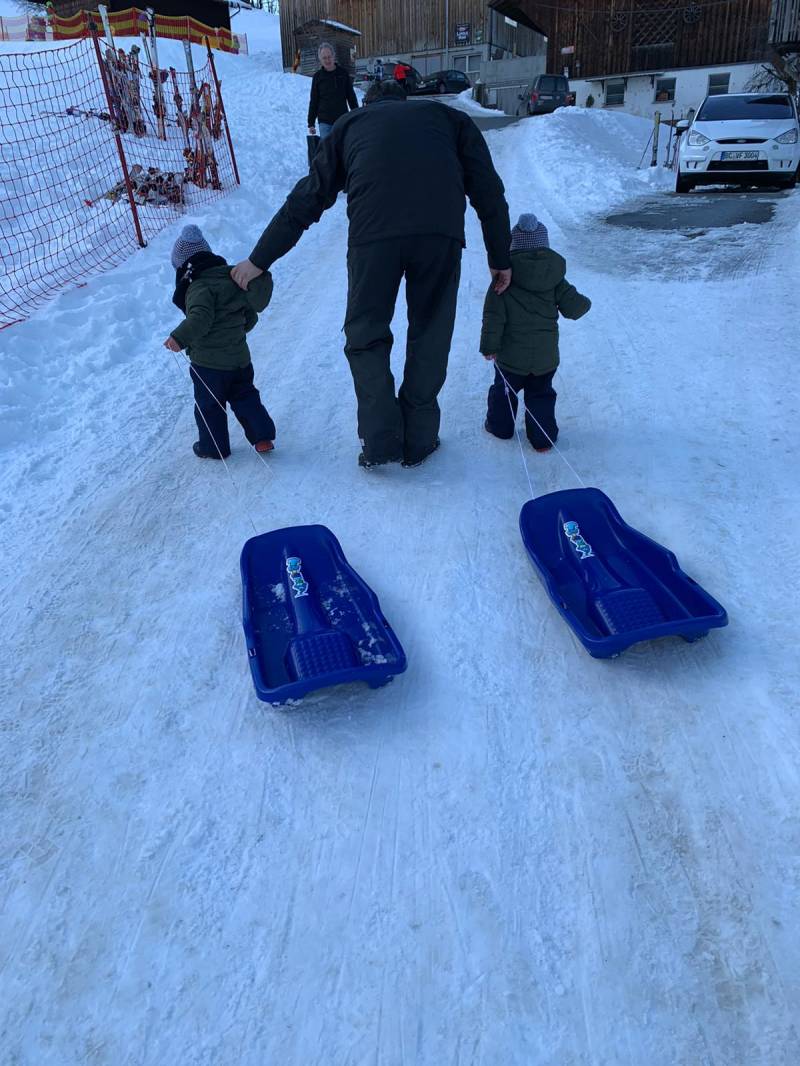 Die verse sneeuw heeft er ook voor gezorgd dat we de dagen erna heel veel sneeuwpret hebben gehad, heerlijke gewandeld, met de slee op pad en sneeuwballen gegooid. De boys wilden perse zelf de slee trekken. Als er mensen naar beneden kwamen op de ski's riepen de boys enthousiast skiën, skiën! Ze konden er geen genoeg van krijgen, heerlijk om die koppies te zien genieten, hierdoor was het voor ons ook dubbel en dwars genieten. We hebben wel 2 mindere dagen gehad, door het weer, maar ook dat mag de pret niet drukken, met spelletjes, boeken en ja ook de TV/Ipad is er voldoende vermaak. Daarbij hadden wij in ons appartement een zwembad.